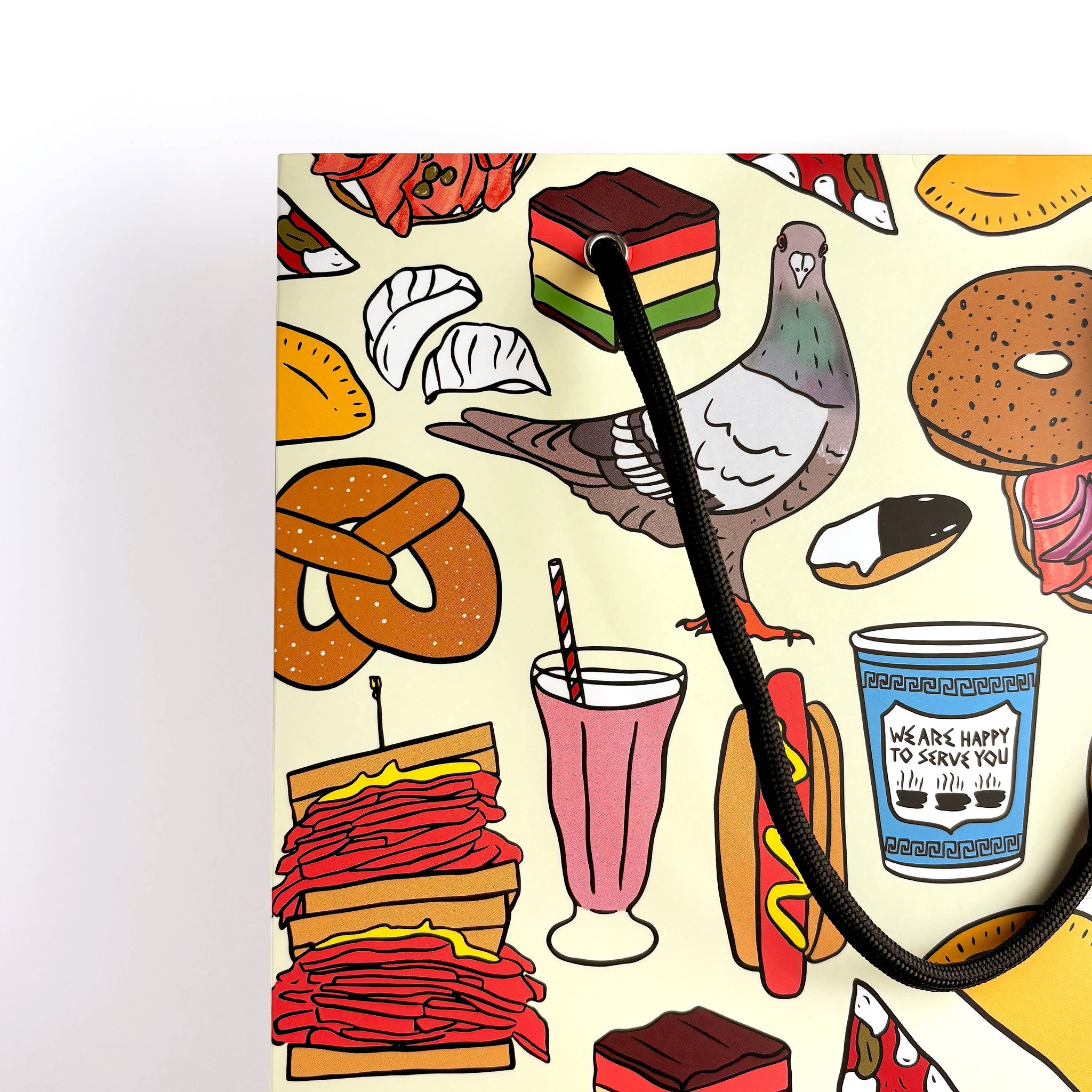 This playfully illustrated gift bag celebrates the delicious chaos of New York City, featuring pigeons mingling with the city’s finest street eats—bagels, hot dogs, pretzels, black & white cookies, and more.